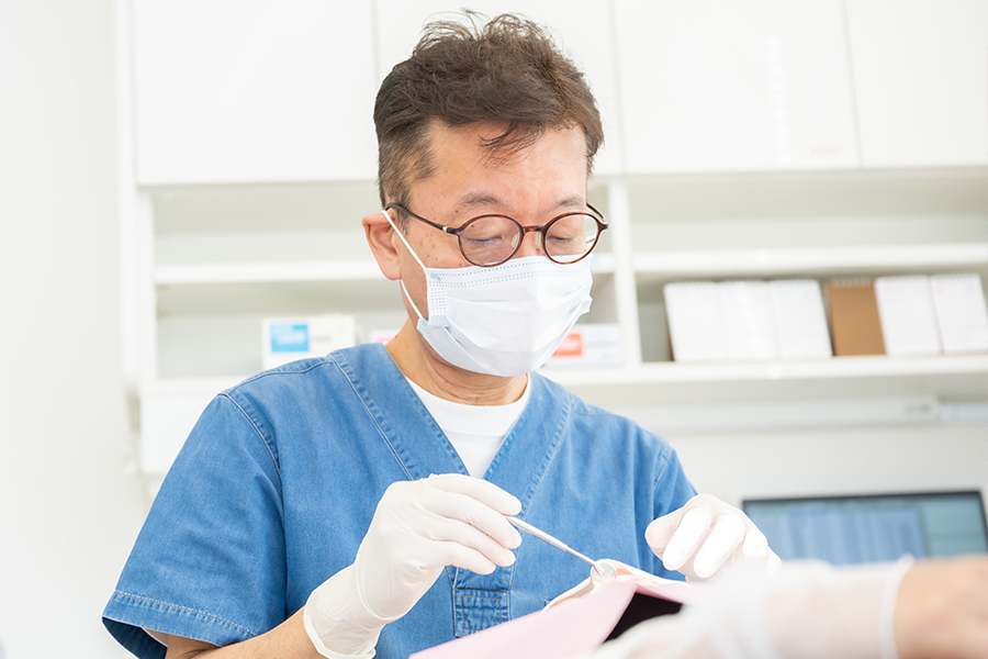 入れ歯治療では、「何でも噛めて、痛みや違和感がなくなるまで」診療することを心がけています。治療前に現在のお悩みや、入れ歯のご希望などを十分にヒアリング。その上で、患者さまに合った入れ歯を作製いたします。入れ歯をお作りした後も「しっかり噛めるか」を重視し、アフターフォローに力を注いでいます。